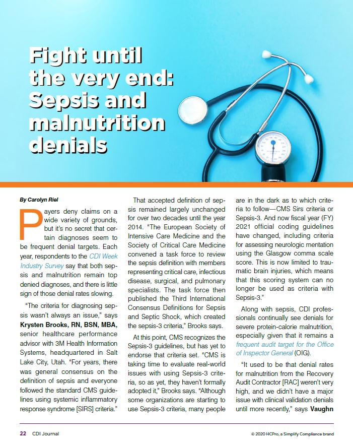 Payers deny claims on a wide variety of grounds, but it’s no secret that certain diagnoses seem to be frequent denial targets. Each year, respondents to the CDI Week Industry Survey say that both sepsis and malnutrition remain top denied diagnoses, and there is little sign of those denial rates slowing.
